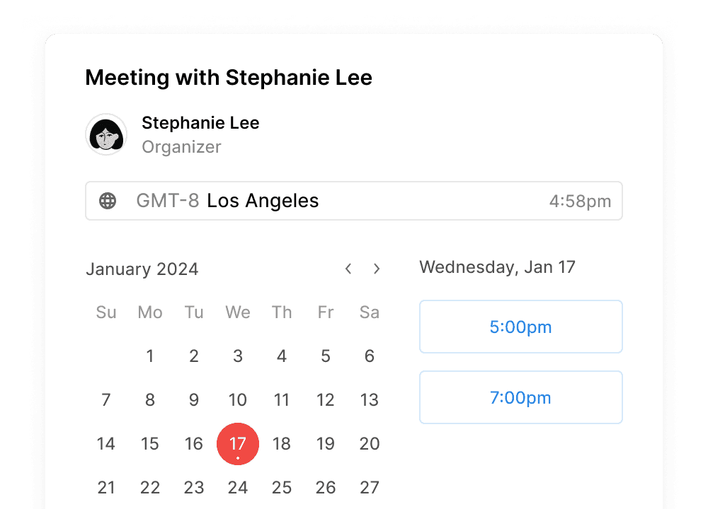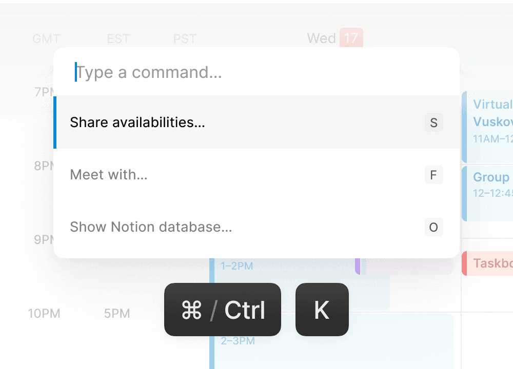 다른 사람들이 나와의 회의나 약속을 잡을 수 있도록 가능 시간과 일정 링크를 보내세요. 다른 앱은 필요 없어요. Notion에서 다 가능하거든요!
